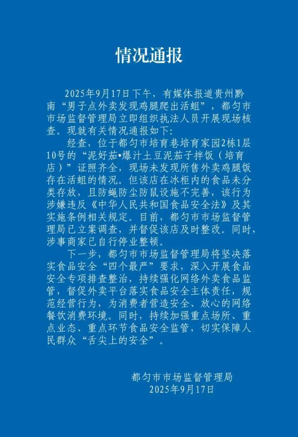 2025年9月17日下战书,有报道贵州黔南“须眉点外卖发觉鸡腿爬出活蛆”,位于都匀市培育巷培育家园2栋1层10号的“泥好茄·爆汁土豆泥茄子拌饭(培育店)”证照齐备,现场未发觉所售外卖鸡腿饭存正在活蛆的环境。且防蝇防尘防鼠设备不完美,该行为涉嫌违反《中华人平易近国食物平安法》及其实施条例相关。目前,都匀市市场监视办理局已立案查询拜访,并督促该店及时整改。同时,涉事商家已自行破产整理。下一步,都匀市市场监视办理局将落实食物平安“四个最严”要求,深切开展食物平安专项排查整治,持续强化收集外卖食物监管,督促外卖平台落实食物平安从体义务,规范运营行为,为消费者营制平安、安心的收集餐饮消费。同时,沉点业态、沉点环节食物平安监管,切实保障人平易近群众“舌尖上的平安”。