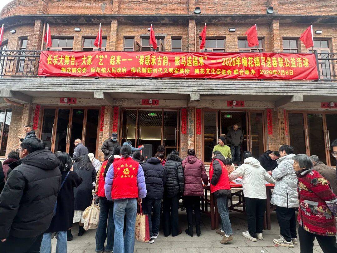 勾当吸引了近300名百名离退休干部、老年和社区居平易近积极参取,墨喷鼻环绕,书法嘉宾们挥毫泼墨,笔走龙蛇。楷书工整、行书超脱,一幅幅寄意吉利的对联、一张张满载祝福的“福”字正在他们的笔下降生,营制出浓浓的节日空气。银龄书法家们正在书写的同时热心分享书法,少年们则专注摹仿,们稳健的笔法取孩子们稚嫩的笔触交相辉映,正在代际互动中中华优良保守文化悄悄传承。2月8日,梅花镇党委、结合梅花镇新时代文明实践所、梅花文化推进会正在梅花古城东城门隆沉举行“对联承古韵 骏马送福来”——2026年梅花镇对联送“福”公益勾当,为泛博群众奉上新春的夸姣祝愿。