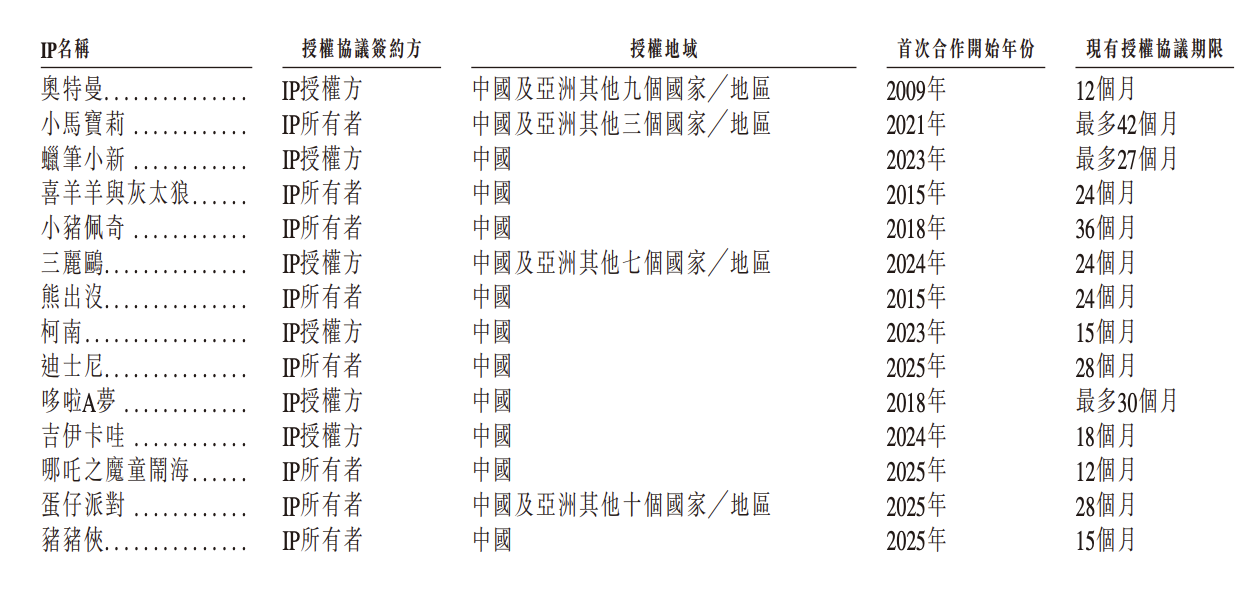 截至2025年6月30日,金添动漫具有笼盖日本、欧美及中国本土的26个授权IP,包罗奥特曼、小马宝莉、蜡笔小新、喜羊羊取灰太狼、小猪佩奇及三丽鸥等出名IP。